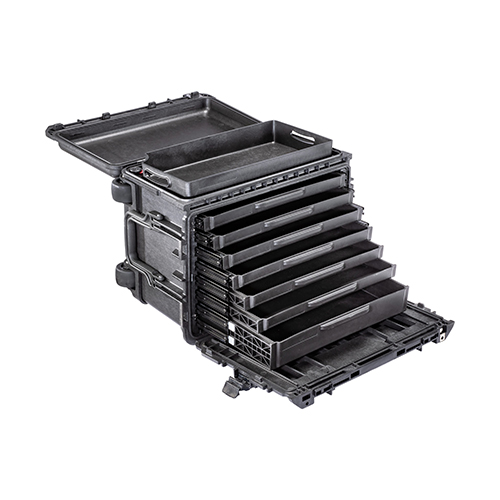 Nuestra caja de herramientas portátil más resistente es ahora aún más robusta. Las bandejas están montadas sobre un sólido sistema de guías de aluminio que permiten extraerlas fácilmente para limpiarlas o reorganizarlas.