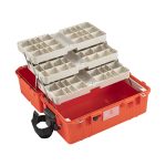- Características: Resistente a golpes, agua y polvo; bandejas extraíbles de tres capas fáciles de limpiar; soporte para objetos cortantes (contenedor no incluido); asa plegable sobremoldeada; cierres de pulsar y tirar probados en presión extrema; protectores de candado de acero inoxidable